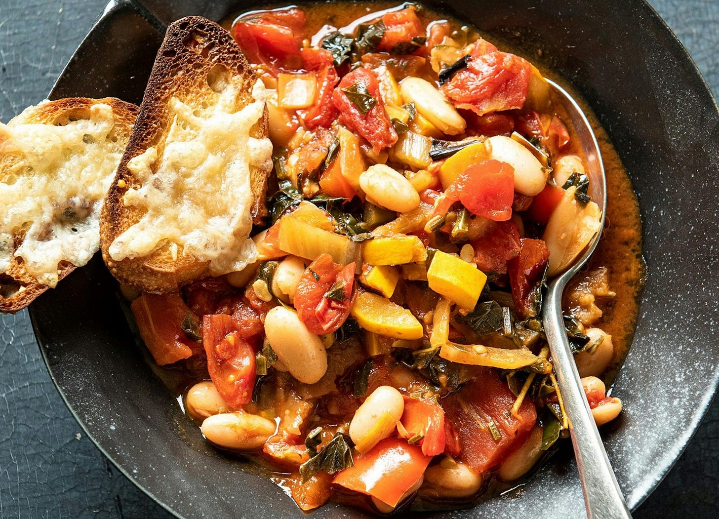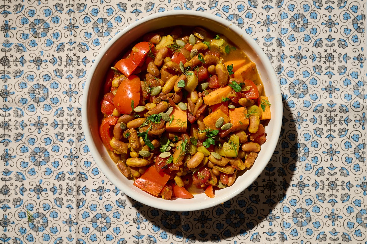 This hearty, simple vegetarian stew begs to be fiddled with, so spice to taste. Hunks of squash add a sweet earthiness to the vibrant notes of Ras el hanout, a complex and aromatic spice blend. This Moroccan seasoning of cumin, coriander, turmeric, cinnamon, nutmeg, cloves, ginger, and pepper, is well worth keeping on hand. Serve the fragrant stew with plenty of pita to sop up all the goodness.